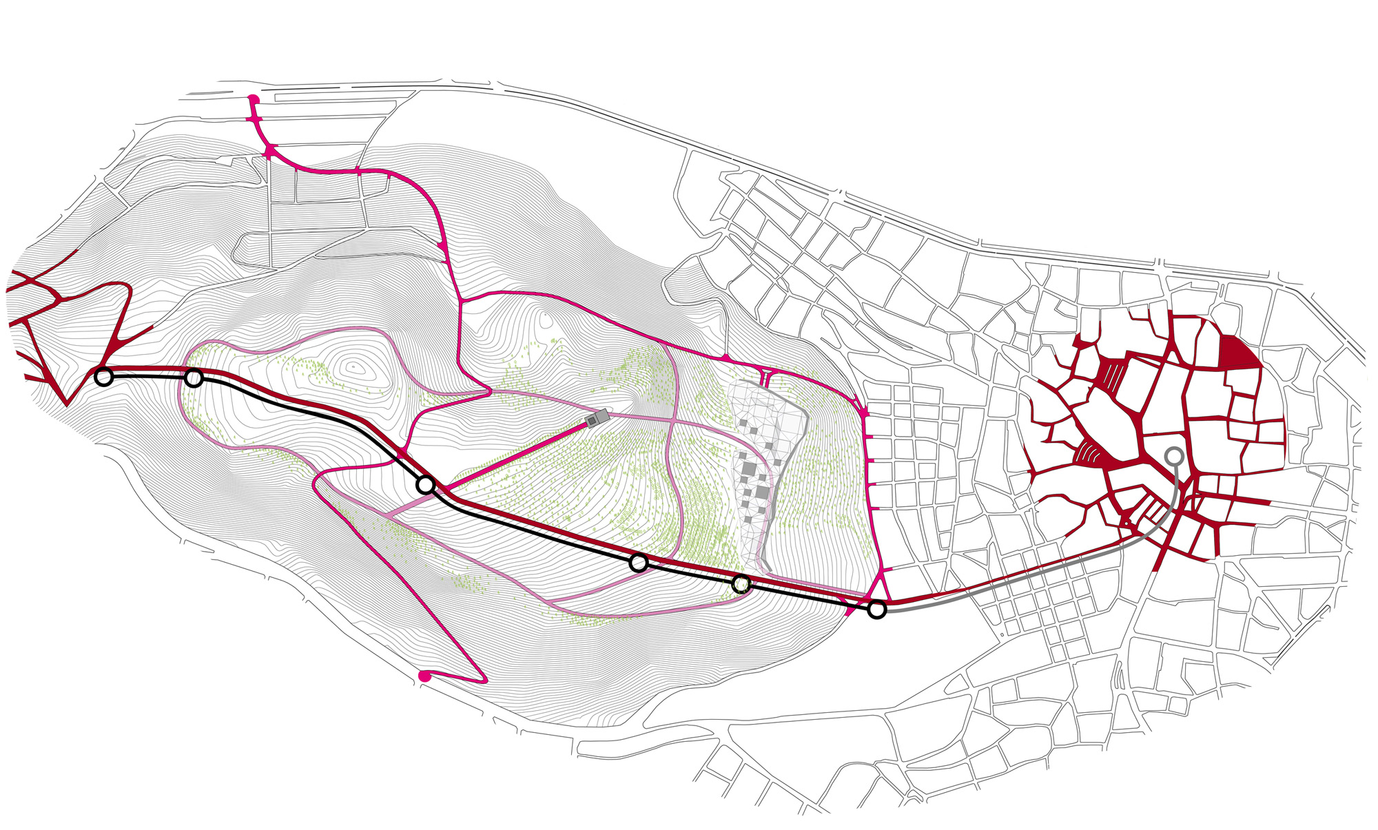 The Project is situated on Çamlık Hill where has the potential to be the new recreational activity center of Balıkesir. the Project consists of a topographic shell emerging out of the sloped landscape and orthogonal program containers rising out of the shell to use both the shell’s lower and upper spaces.The rigid morphology of the program containers and the fluid morphology of the topographic shell