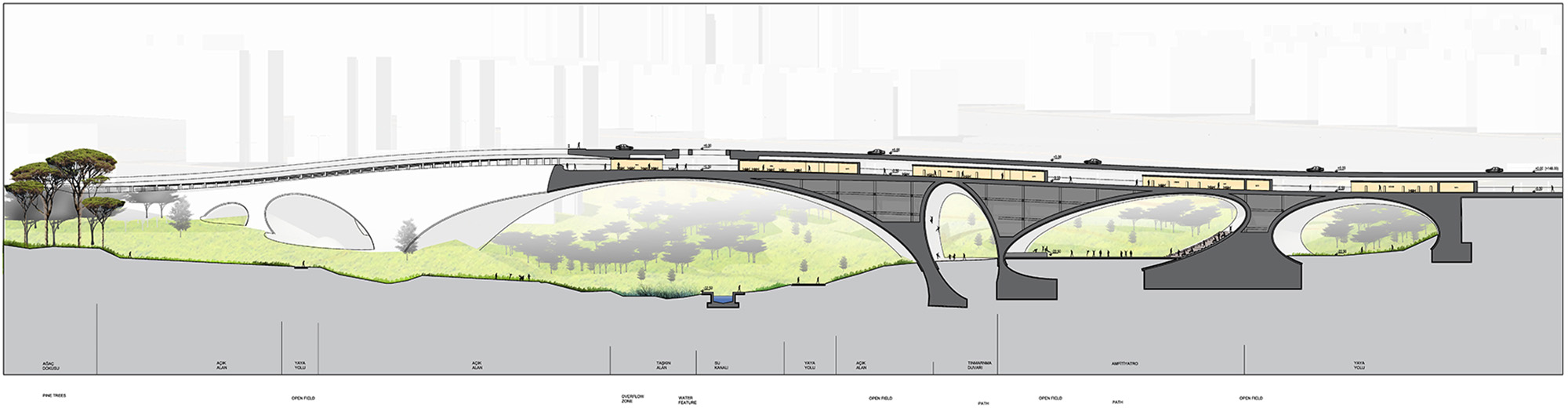 Beylikdüzü Municipality Bridge and Valley Competition Beylikdüzü is a district on the far European side of İstanbul with a rich landscape and topography. As the city has expanded, development started splintering due to cutting valleys with streams that feed into the Marmara Sea. These valleys, however, also provide opportunities for this developing part of the city to make large recreational areas that fit in between neighborhoods. One way to activate this change is by creating bridges above the natural landscape which stitch the urban texture together at strategic points. The bridges should then try to integrate into the park by housing and providing social functions within, while also having them read as sculptures that are installed within the design of the landscape.