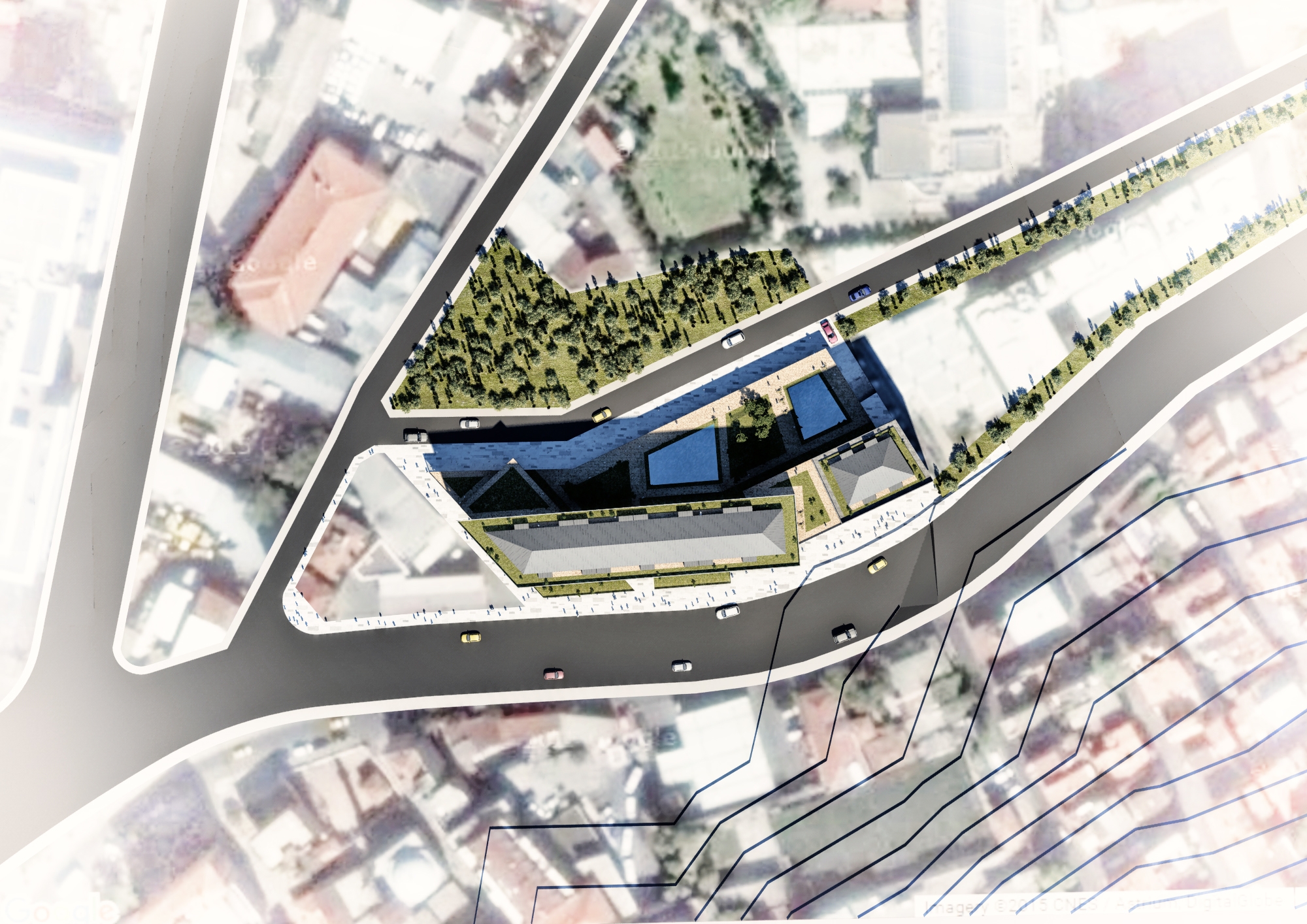 Dolapdere Housing The Dolapdere neighborhood in İstanbul is currently going through a phase of urban gentrification due to is proximity to Taksim Square and its accessibility to the highway. The aim of this project was to provide a set of diverse living spaces within a predominately non-residential neighborhood. This is achieved by cracking a linear housing block into several pieces, which in turn creates various chance meeting places between stacked masses of apartment typologies. The base of the project is used mostly for retail, with its roof providing residents with social functions such as a pool surrounded by gardens.