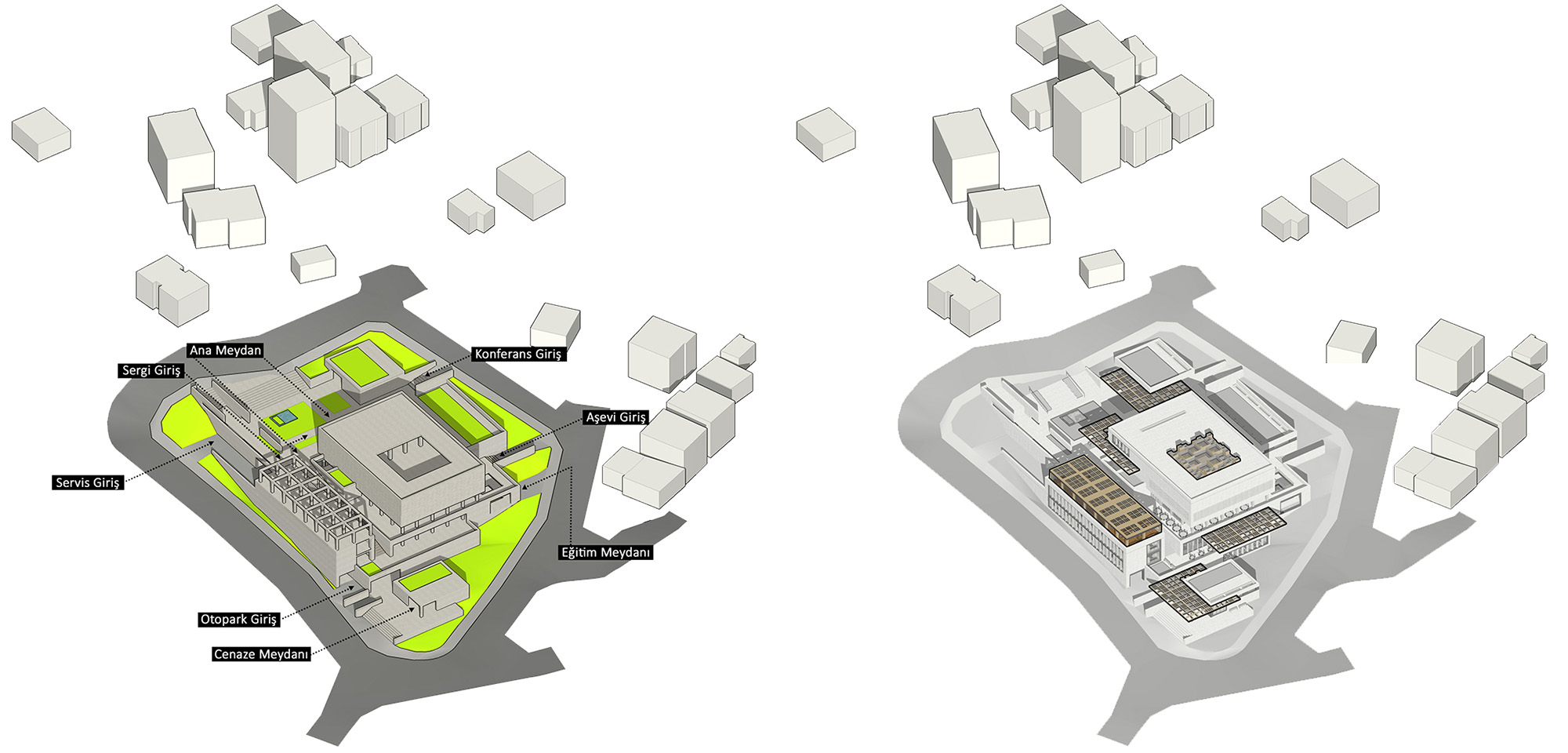 Cemevi is a house of gathering for multi-functional cultural activities structured around the religious Alevi ritual called Cem. Instead of falling into vulgar symbolic traps as is prevalent in architectural culture whenever religious architecture is the subject, ABOUTBLANK´s design approach emphasizes;(1) nature - culture continuum with the adaptive use of topography, (2) programmatic dissemination within an enmeshed cultural complex, (3) rich spatial diversity with the use of closed, open, and semi - open spaces, and (4) rigorous urban integration with the surrounding environment.Date: july 2015