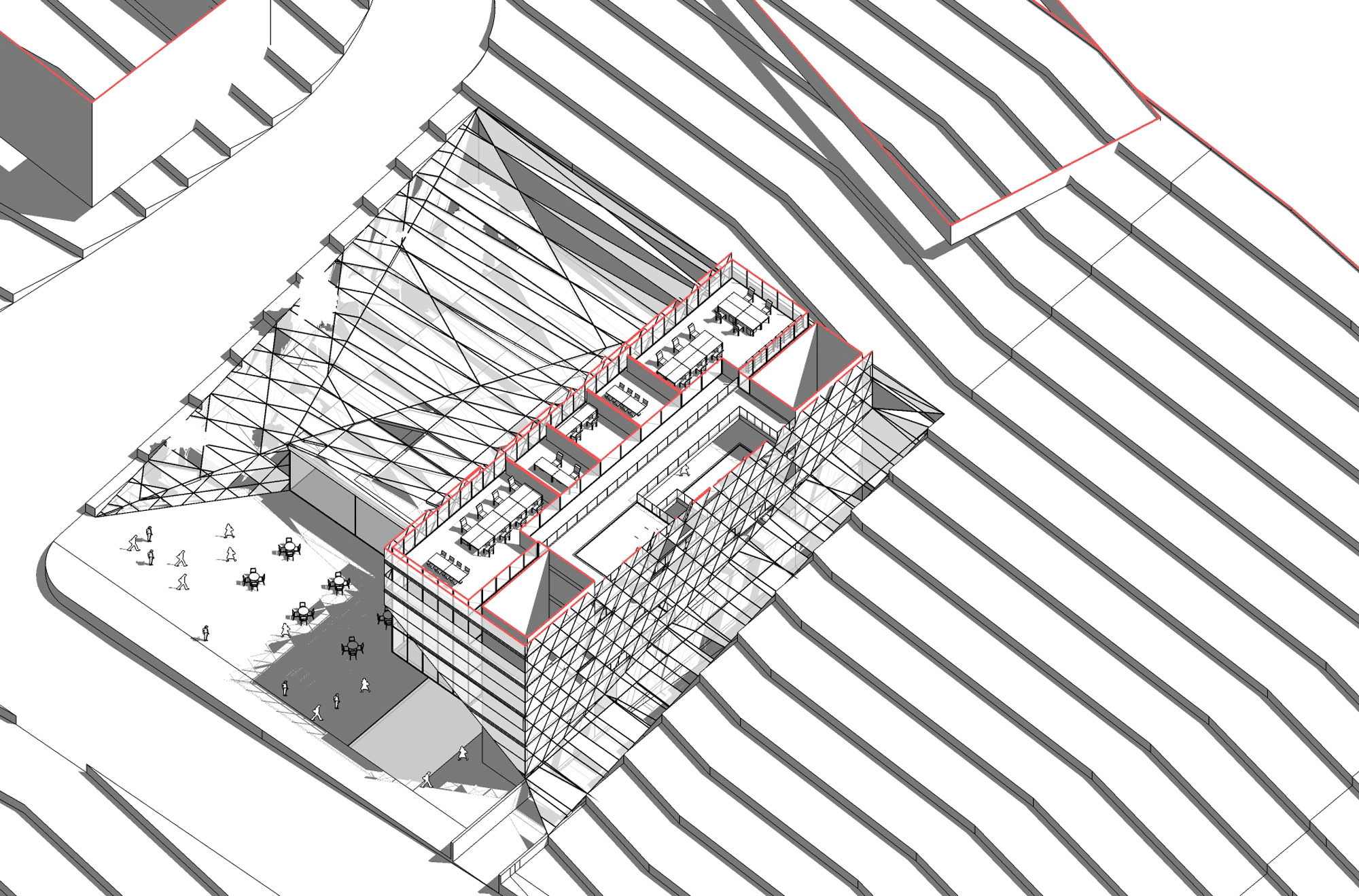 On a steep hill in Maltepe on the asian side of İstanbul, a client wanted a design for an open office building. The size of the site forces the design to be thin and tall, with its main orientation facing the prevailing view of the area. In turn because of the orientation, the glass box needs protection from the sun. This gives way to the opportunity to make an iconic skin that does not obstruct the view for the building's workers. The double facade also connects the office mass to the retail base, and allows the design to include semi-open spaces for recreational activities.